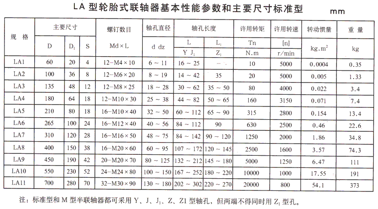 LLA型冶金設備用輪胎式聯(lián)軸器基本性能參數(shù)和主要尺寸